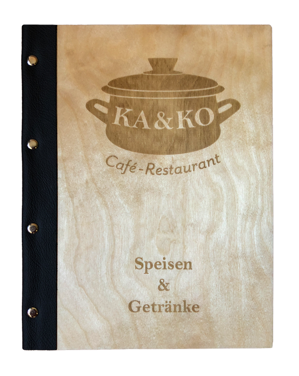 Das Design der Speisekarte wurde komplett überarbeitet. Der neue Einband aus hellem Birkenholz mit Logo Gravur vermittelt Harmonie und Gastfreundschaft.